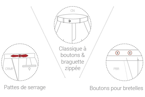 Porter des bretelles est le meilleur moyen de garder son pantalon en place. Optez pour de vraies bretelles en cuir et pour vous, nous coudrons des boutons à l’intérieur de la ceinture.